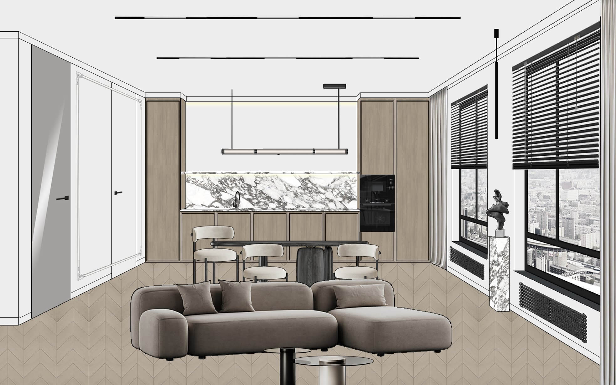 На каждое помещение мы предлагаем по 2 варианта дизайна с реальными позициями мебели, освещения и материалов. Только после утвержденного концепта мы переходим к разработке фотореалистичных 3D визуализаций.